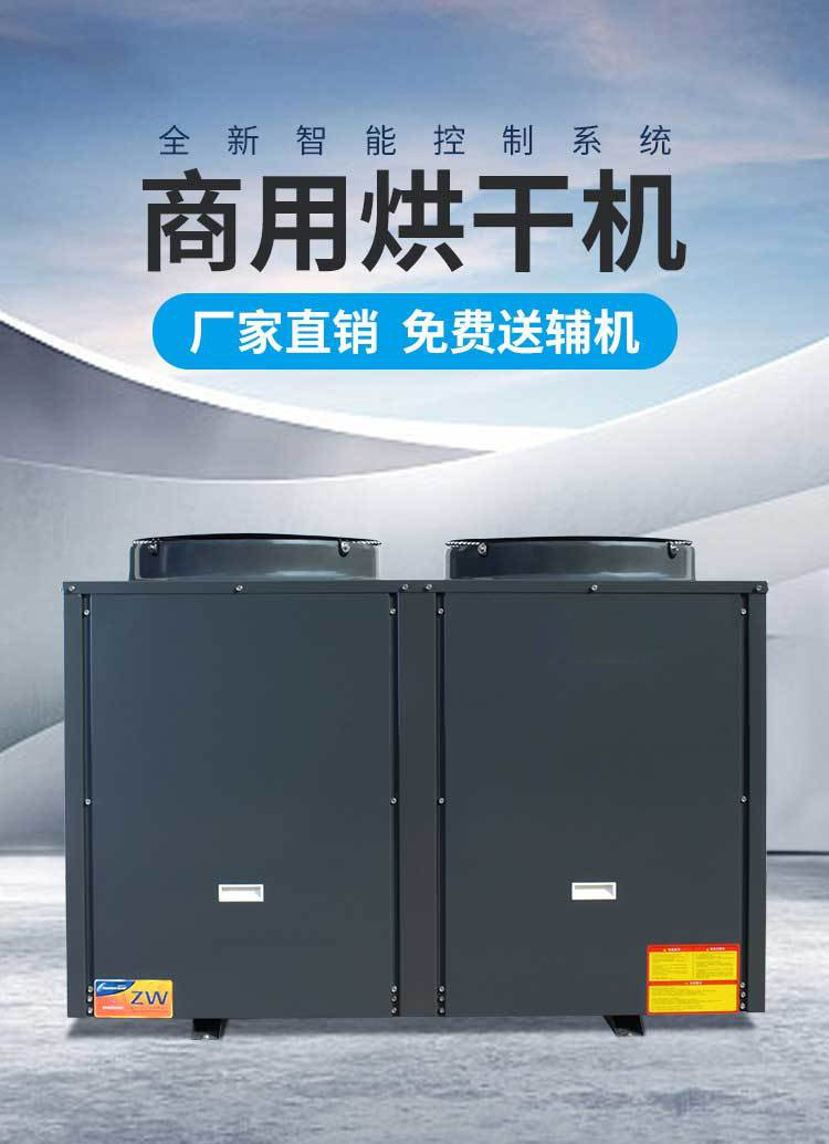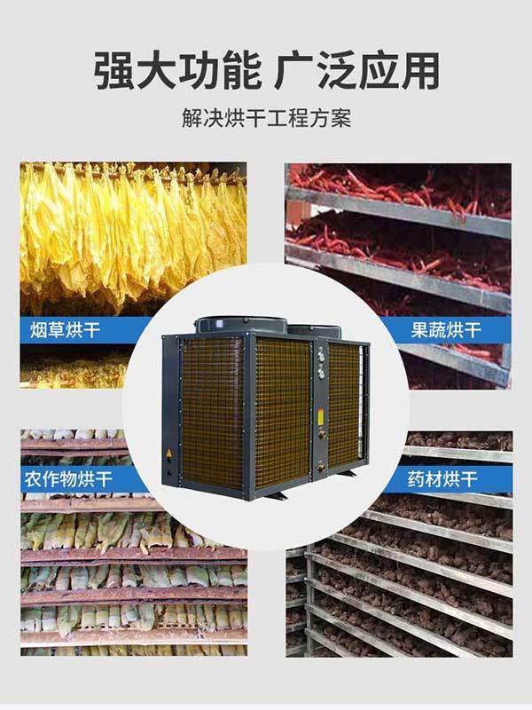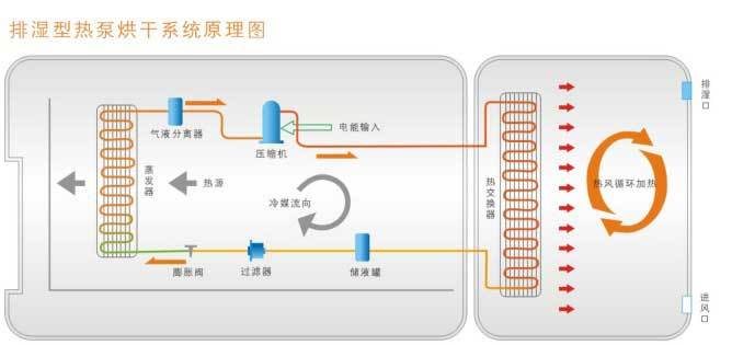 热泵烘干机组中的压缩机从蒸发器中吸入低温低压制冷剂(俗称冷媒)气体,通过压缩机做功将冷媒压缩成高温高压冷媒气体。高温高压冷媒气体进入热交换器进行热量交换,在热量交换器中被冷凝成低温高压的液态冷媒而放岀大量热量,通过风杋转化为热风,热风在烘干箱内反复循环加热物料使物料中的水份不断释出、汽化、经换风排湿或冷凝除湿,最终实现物料干燥。